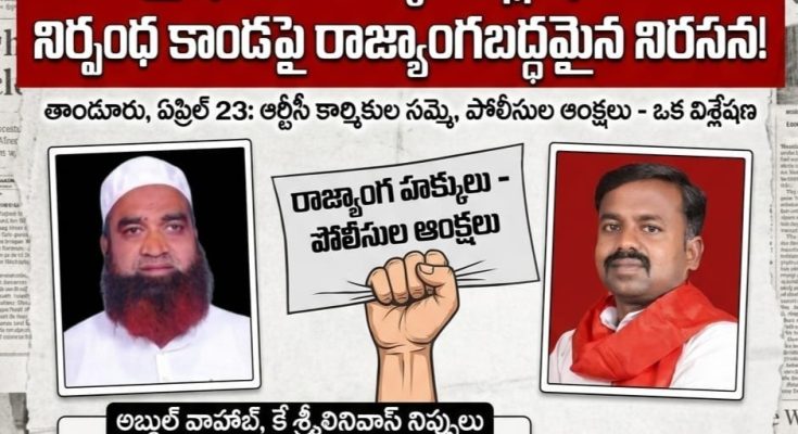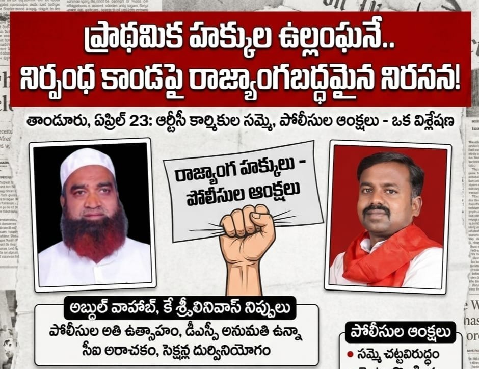 తాండూరు, manasa news ప్రతినిధి,తాండూరులో ఆర్టీసీ కార్మికుల సమ్మె సందర్భంగా పోలీసులు విధిస్తున్న ఆంక్షలు పౌరుల రాజ్యాంగబద్ధమైన ప్రాథమిక హక్కుల అమలుపై ప్రభావం చూపుతున్నాయని సామాజిక, కార్మిక సంఘాల ప్రతినిధులు తెలిపారు.భావప్రకటన స్వేచ్ఛ, శాంతియుతంగా సమావేశమయ్యే హక్కు ప్రజాస్వామ్య వ్యవస్థలో కీలకమైనవని పేర్కొంటూ, నిరసన కార్యక్రమాలకు సంబంధించిన ఏర్పాట్లను అడ్డుకోవడం, టెంట్ల తొలగింపు వంటి చర్యలు ఆ హక్కుల అమలుపై సందేహాలు రేకెత్తిస్తున్నాయని అభిప్రాయపడ్డారు. టెంట్ హౌస్ నిర్వాహకులపై చర్యల హెచ్చరికలు చేయడం వృత్తి స్వేచ్ఛకు విరుద్ధమని కూడా వారు పేర్కొన్నారు.డీఎస్పీ స్థాయి అనుమతులు ఉన్నప్పటికీ స్థానిక స్థాయిలో చర్యలు భిన్నంగా అమలవుతున్నాయని, చట్టాల అమలులో సమన్వయం అవసరమని సూచించారు. శాంతిభద్రతల పరిరక్షణతో పాటు పౌర హక్కుల పరిరక్షణకు సమాన ప్రాధాన్యం ఇవ్వాలని వారు పేర్కొన్నారు.కార్మికులు మరియు సంబంధిత వ్యాపారులపై నమోదైన కేసులను పునఃసమీక్షించి తగిన నిర్ణయం తీసుకోవాలని, పౌరుల జీవన హక్కు మరియు గౌరవాన్ని కాపాడాలని, కార్మికుల సమస్యలపై ప్రభుత్వం త్వరితగతిన స్పందించి పరిష్కార మార్గాలు అన్వేషించాలని ప్రతినిధులు కోరారు. ప్రభుత్వం మరియు పోలీసులు రాజ్యాంగ విలువలకు అనుగుణంగా వ్యవహరించి పరిస్థితులను శాంతియుతంగా పరిష్కరించే దిశగా చర్యలు తీసుకోవాలని వారు విజ్ఞప్తి చేశారు.