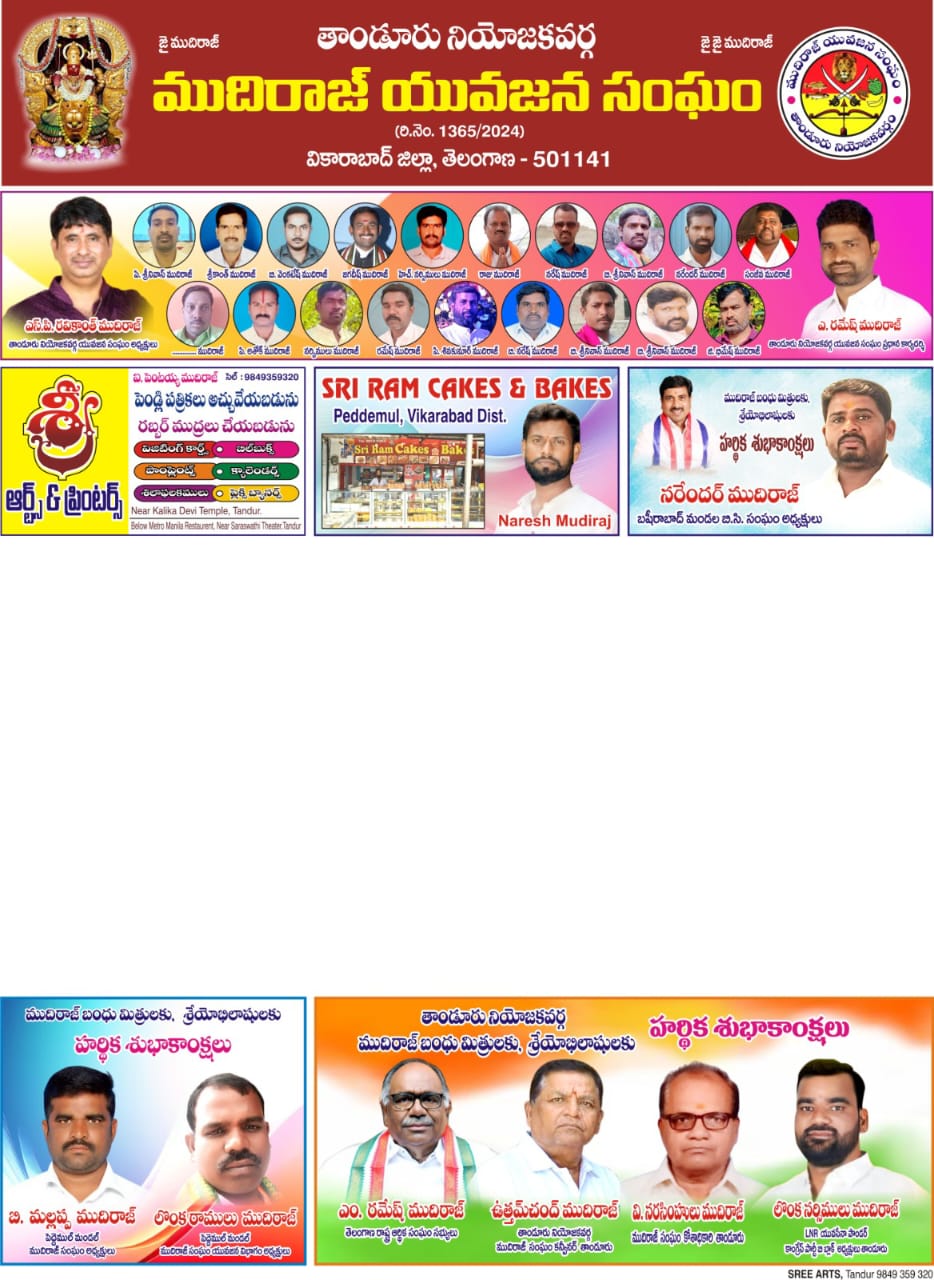 ముదిరాజ్ బంధుమిత్రులకు నమస్కారం తేది 19-01-25 ఆదివారం రోజున తాండూరు పట్టణం నందు ఎంపీటీ ఫంక్షన్ హాల్ లో తాండూర్ నియోజకవర్గ ముదిరాజ్ యువజన సంఘం క్యాలెండర్ ఆవిష్కరణ కార్యక్రమం కలదు.. కావున ఇట్టి కార్యక్రమానికి తాండూర్ నియోజకవర్గ …